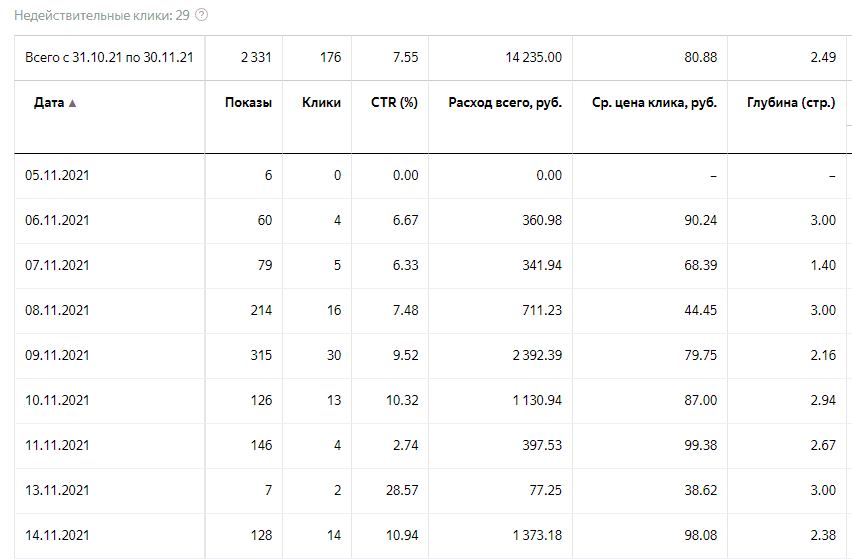 Отличный CTR, для данной ниши довольно низкая средняя стоимость перехода 80 рублей, отличный показатель глубины просмотра сайта.
