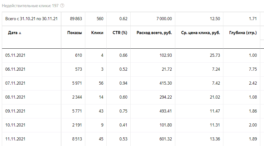 Отличный CTR, для данной ниши довольно низкая средняя стоимость перехода 80 рублей, отличный показатель глубины просмотра сайта.