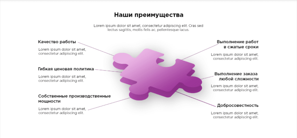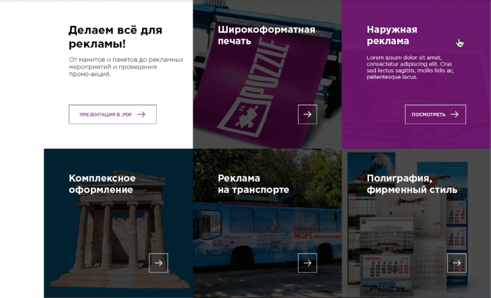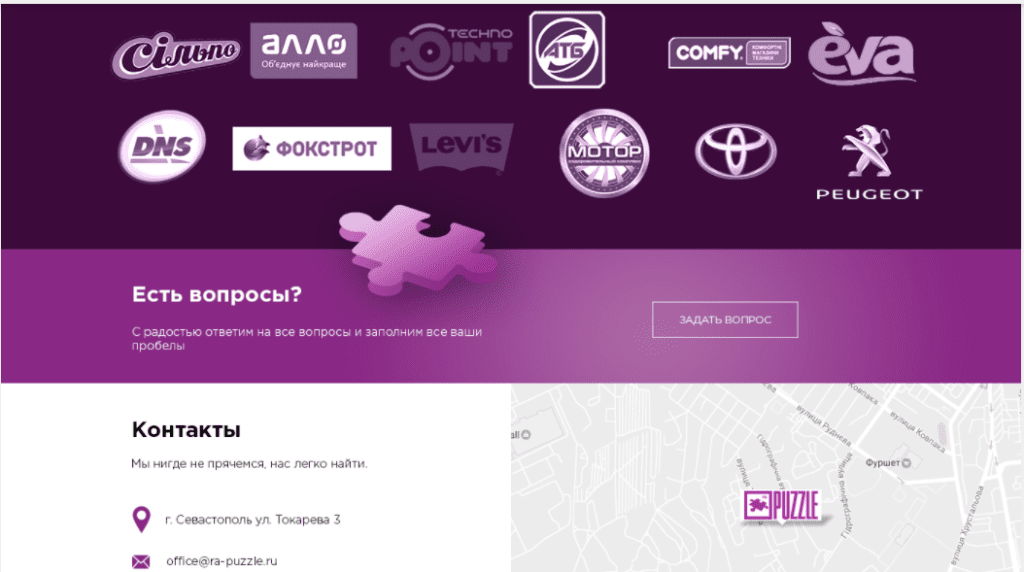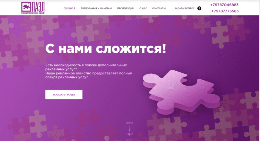 Разработка одностраничного сайта для рекламно-производственной компании “Пазл”. CMS система была выбрана WordPress.