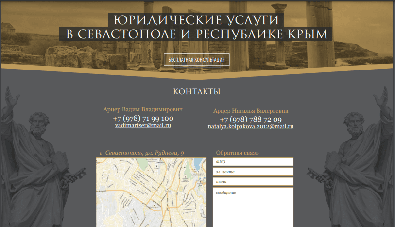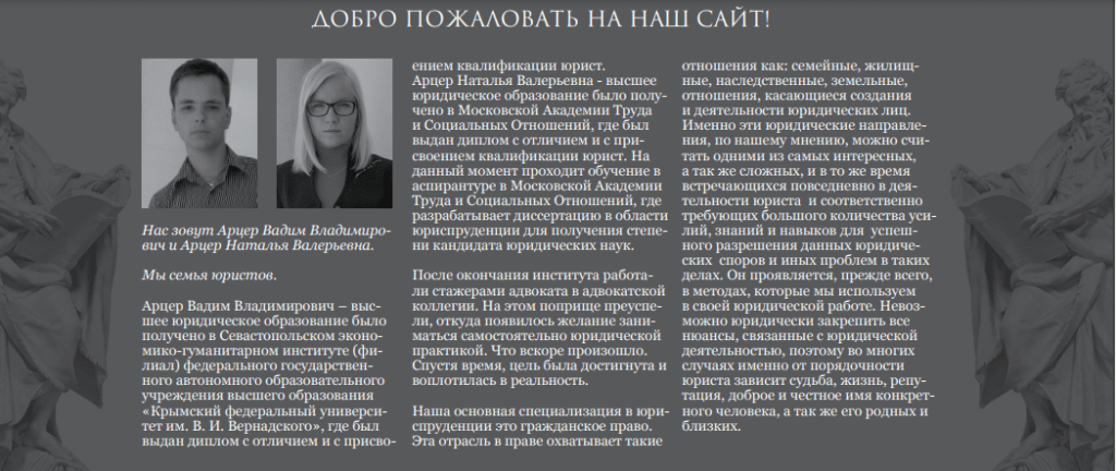 Проекту уже практически 8 лет. К нам пришел по рекомендации юрист Вадим Арцер и заказал у нас разработку логотипа, а после и сайта. На данный момент работаем со всей семьей Арцер с большим удовольствием!